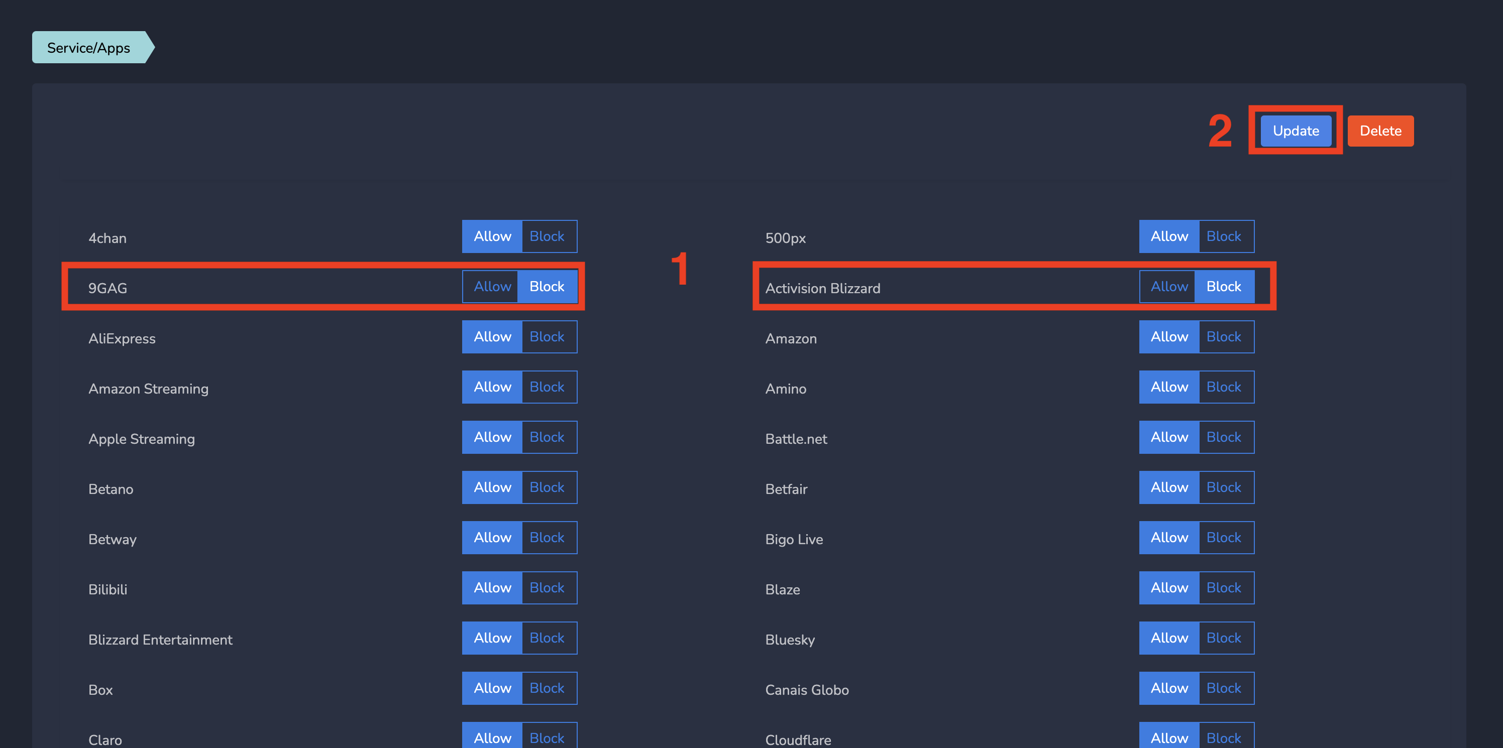 By default, all services/applications are allowed. If you want to change (ALLOW to BLOCK and vice versa) some of the services/applications as per end customer requirements, please follow below steps.