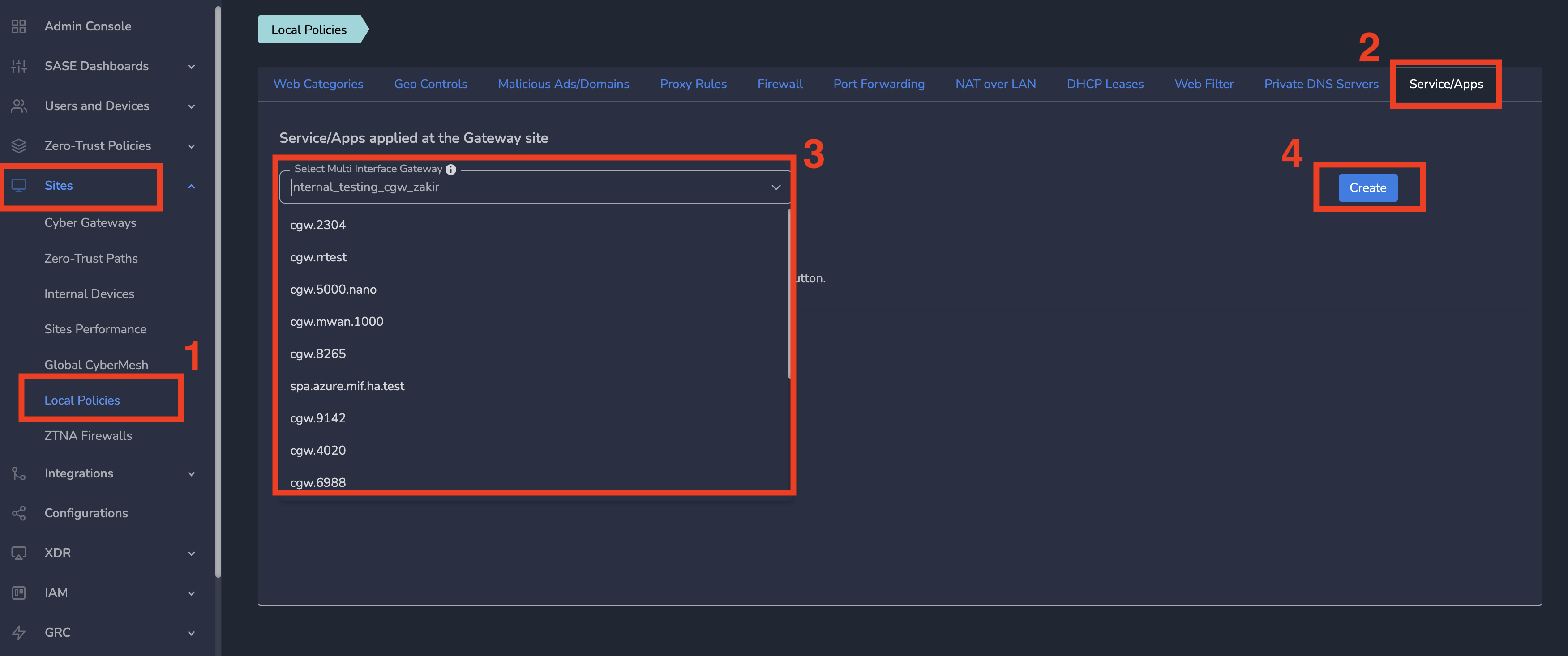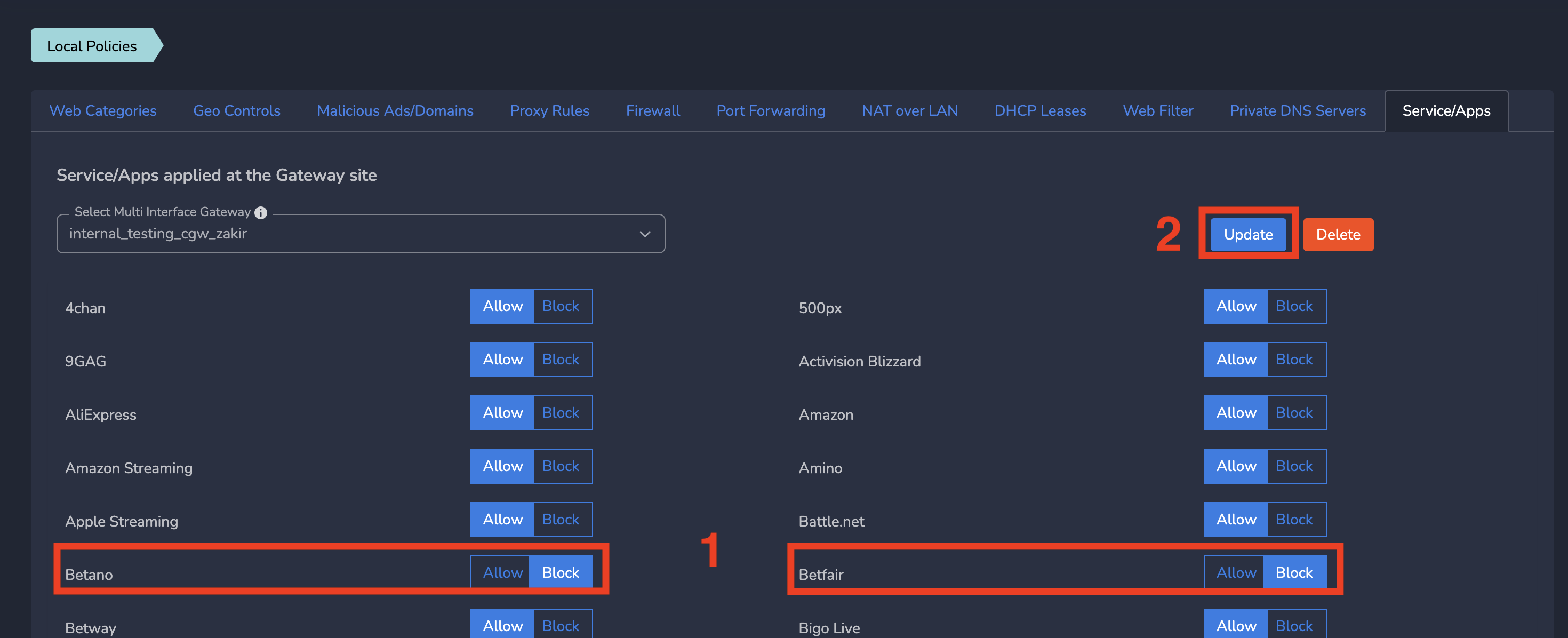 You can define service/application policies at each site level (where CyberGateway is deployed) which will be applied to all devices in the site. To create web service/application policies, Follow below steps