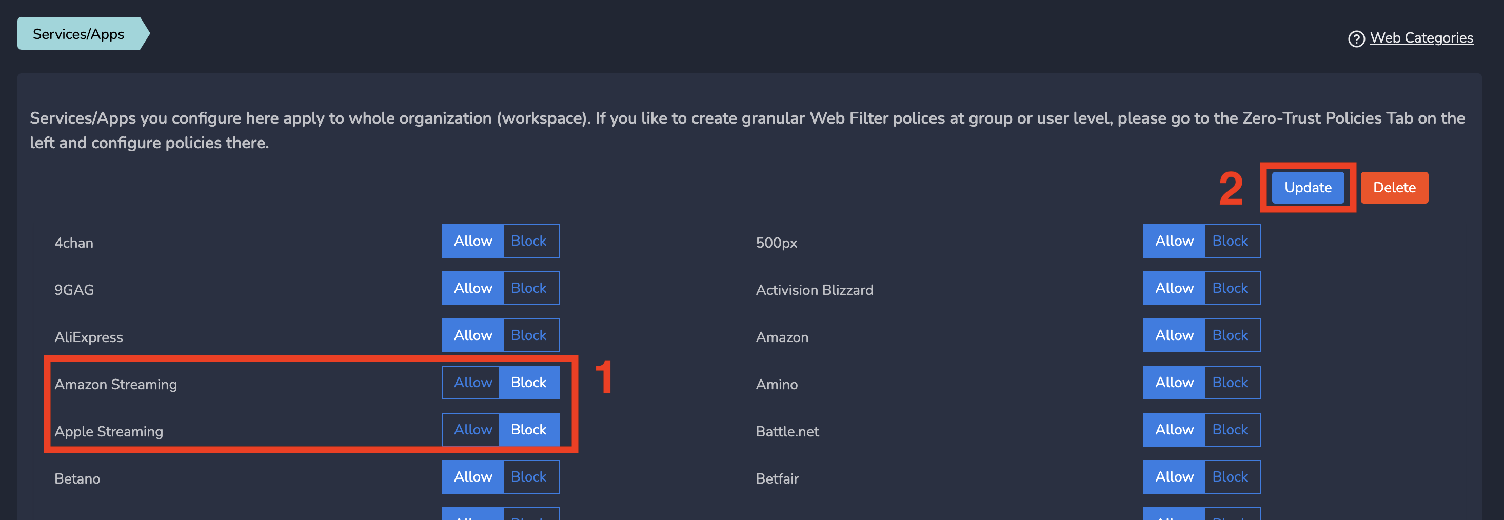 Web Services/Applications Policies enable admins to configure ALLOW/BLOCK of different web applications.