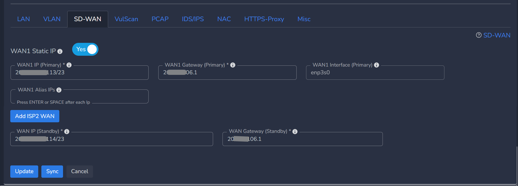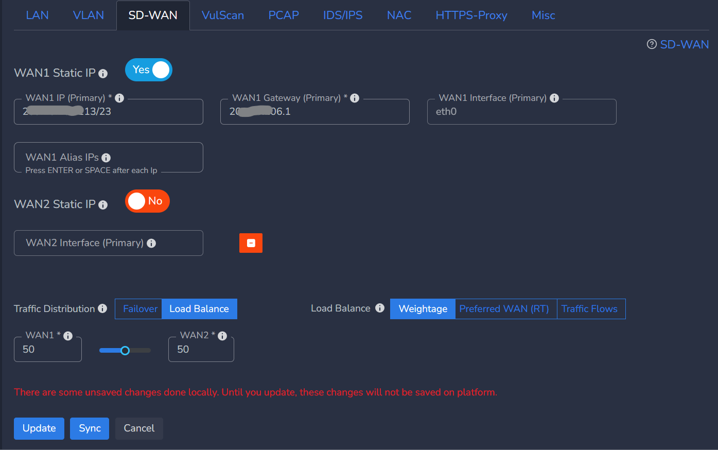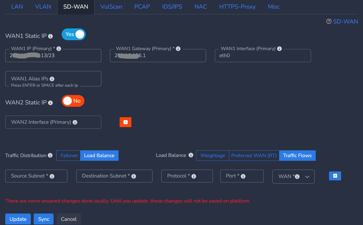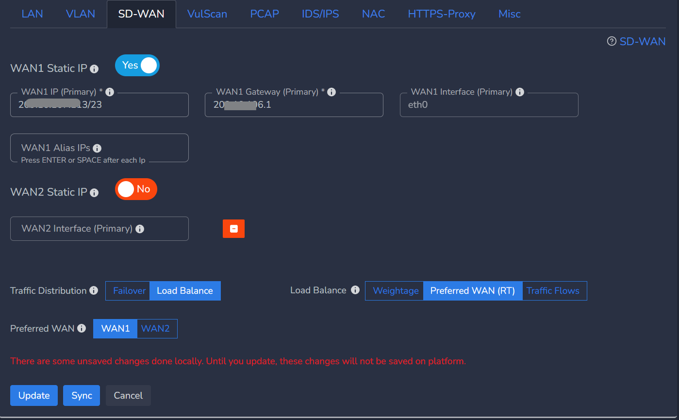 Add WAN1 IP andWAN1 Gateway details as shown in picture (These static entries are always public IPs with their respective gateway. Below example shows only a way of configuration. Please use your actual public IPs instead of sample IPs.)