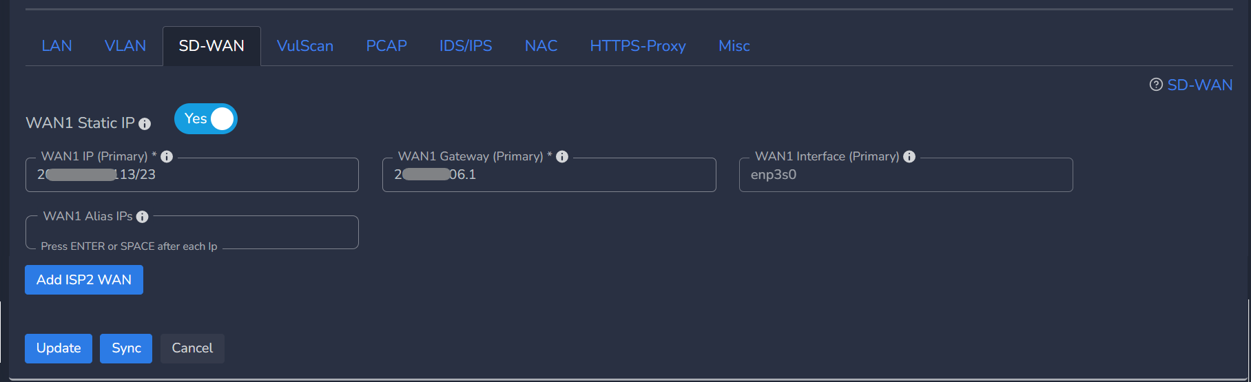 Toggle WAN Static IP to switch to Yes in SD-WAN configuration section, if you want to use static IP on each of the WAN interfaces, Skip and refer below section for Dynamic IPs on WAN interfaces in case you don't have static IPs for WAN interfaces.