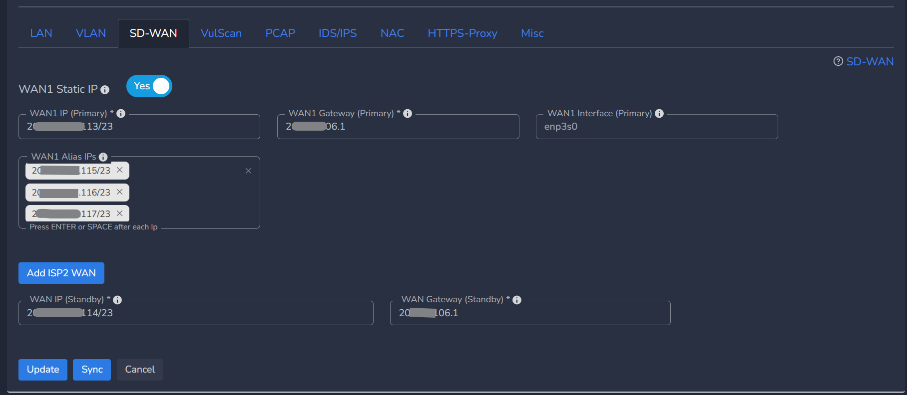 For WAN1 Alias IPs, configure values. Use space or enter key after adding valid IP entry with mast, as shown below. Do not change WAN1 interface name, it is populated by application for display purpose.