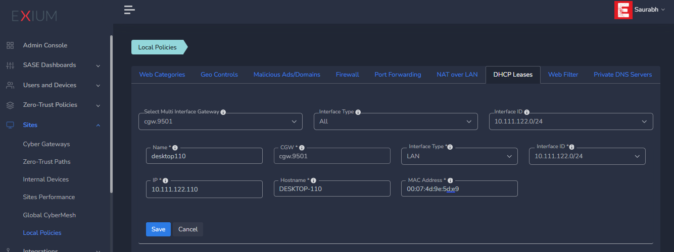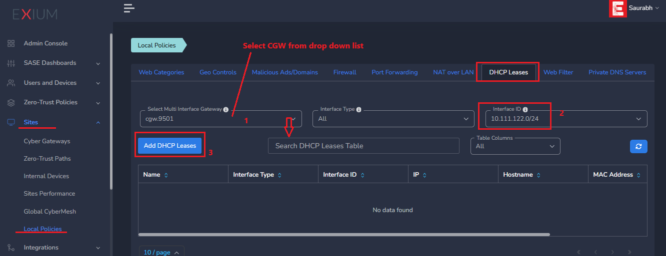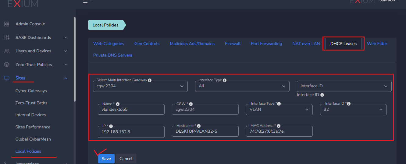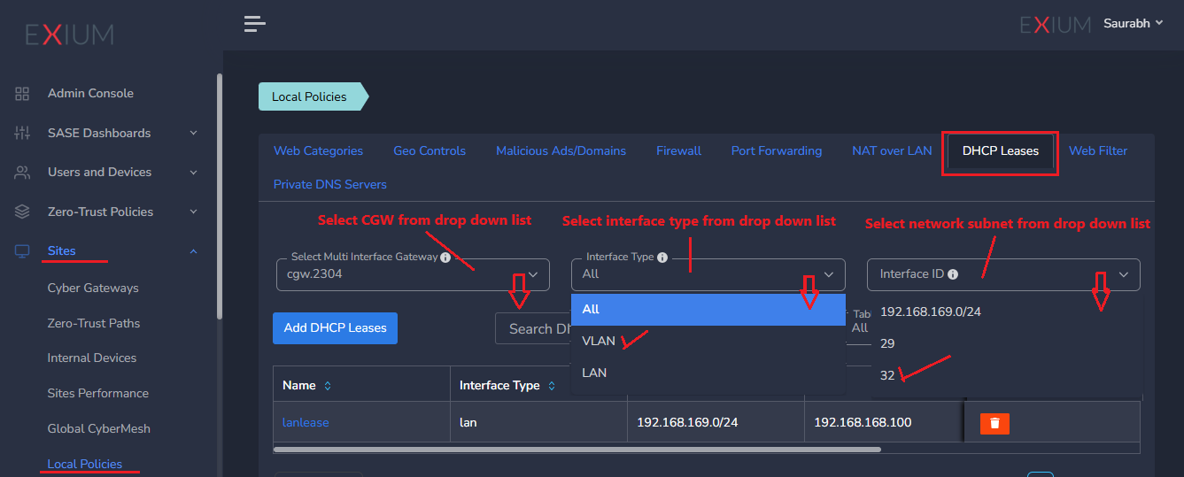 To configure DHCP leases for a new Cyber Gateway deployment on LAN interface, follow the steps below.