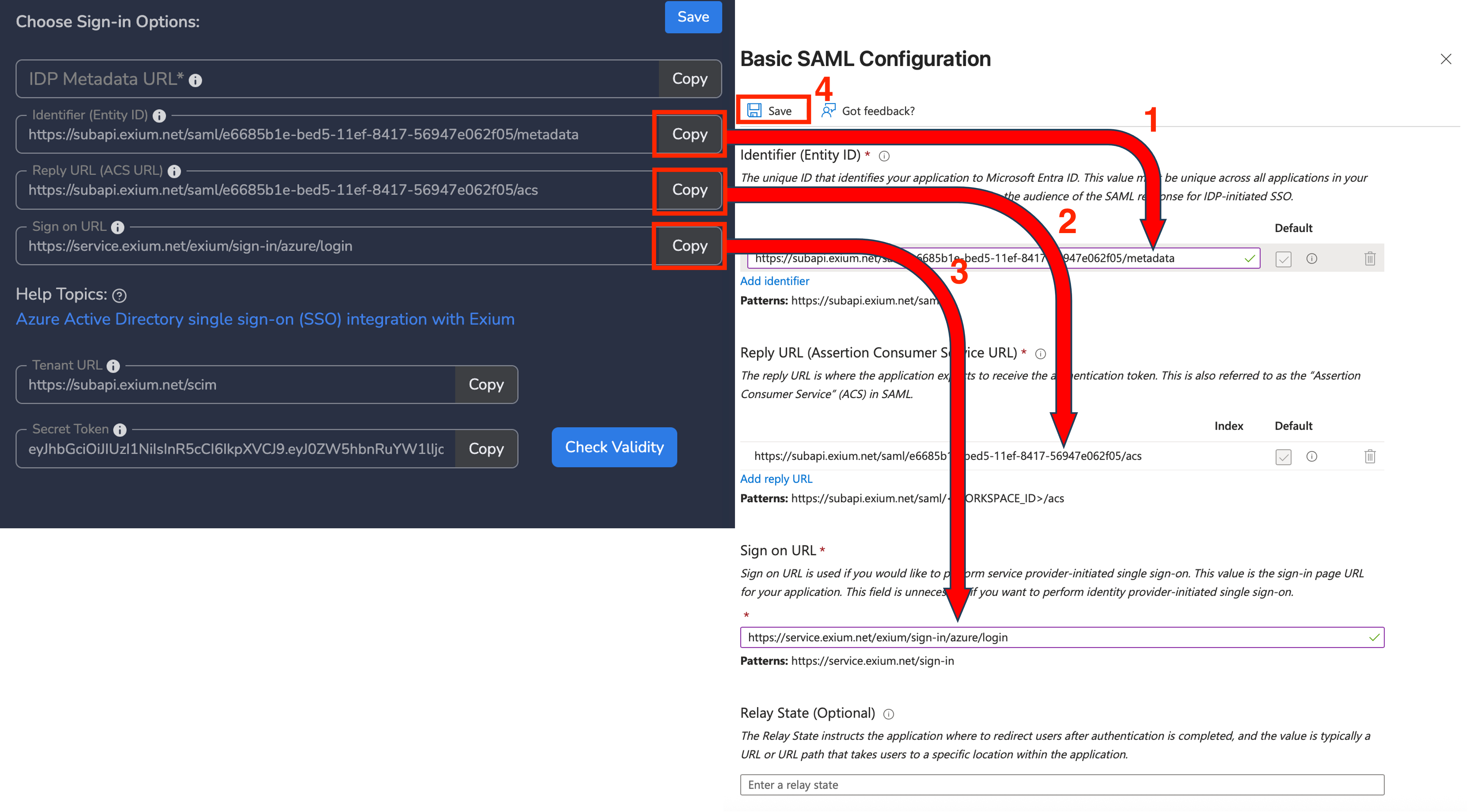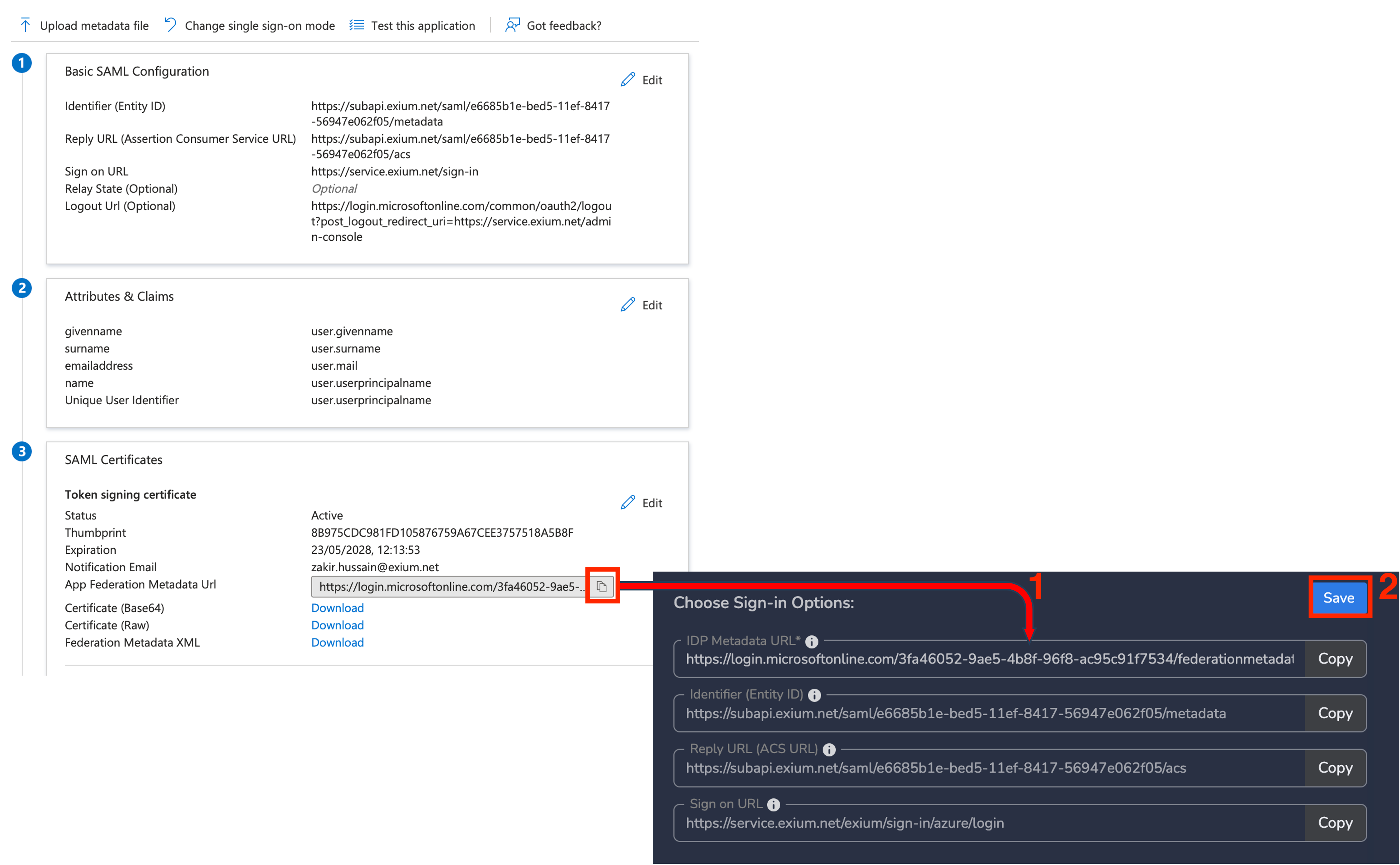 As a next step, Sign-in option on Exium Portal has to be saved by filling-in IDP Metadata URL. This URL is available on Exium Azure AD app. Following steps elaborate on this.