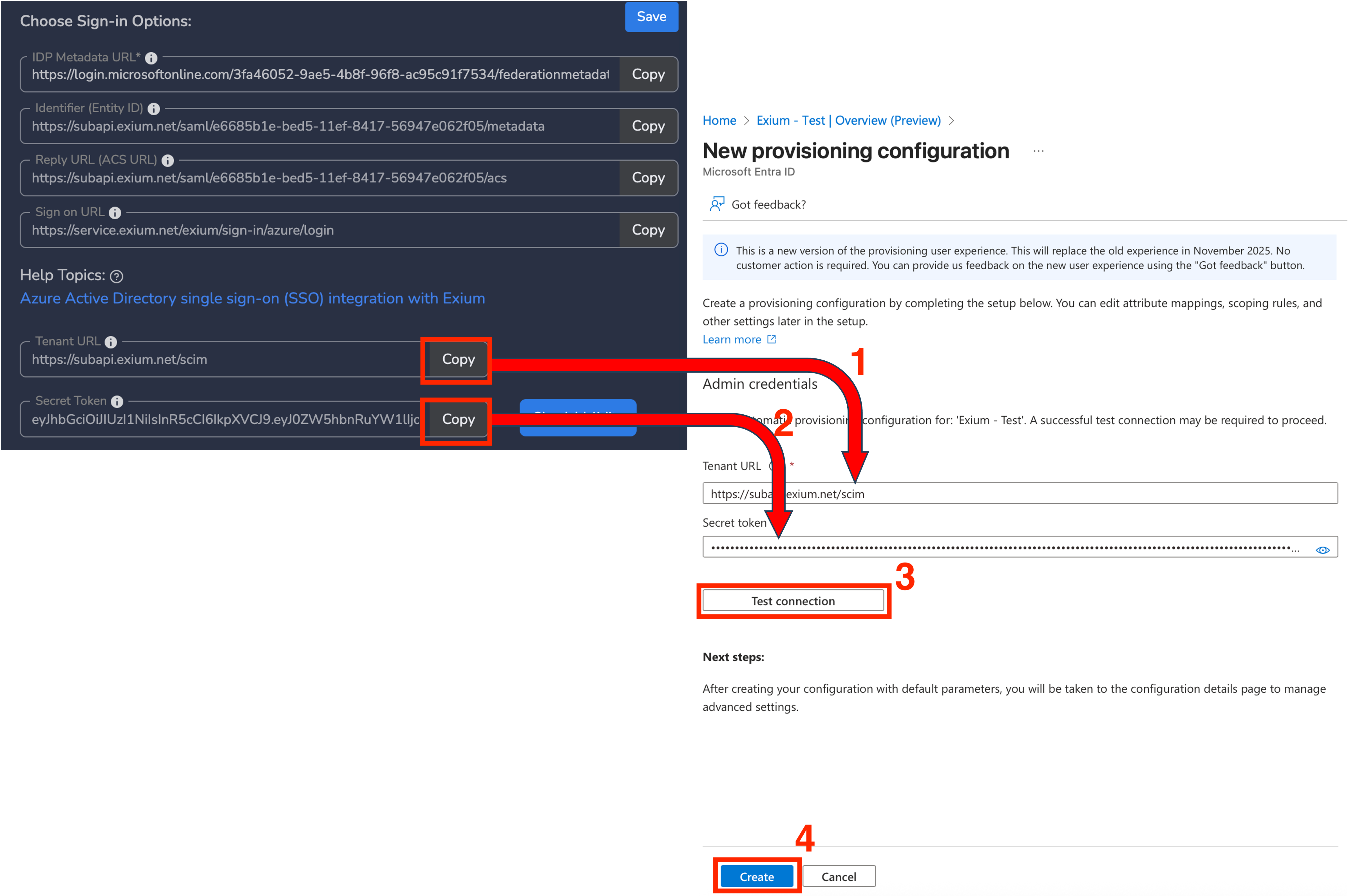 On New Provisioning Configuration page, Tenant URL and Secret Token as shown below. These settings are available on Exium Portal,