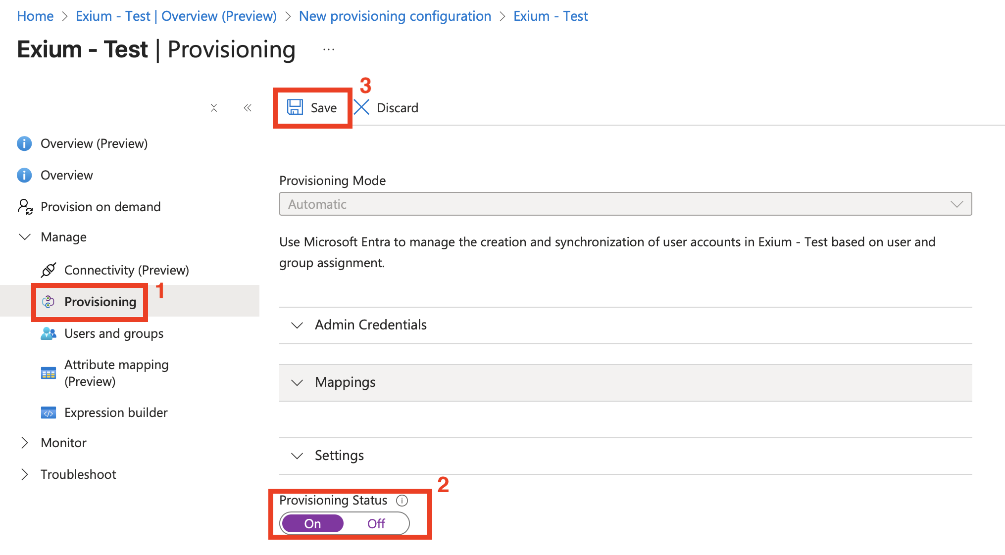 As a next step, Click on Provisioning tab on left nabber, Select On for Provisioning Status as shown below and Click on Save.