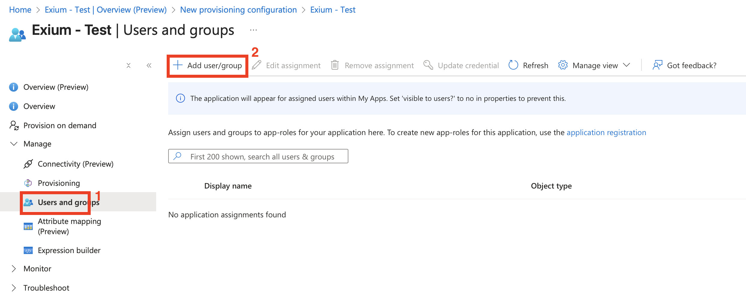 As a next step, you can assign users and groups to Exium app on Azure AD. This can be done whenever you wish to add more users or groups to Exium app. Click on Users and groups on left navigation bar under Exium app and Click on Add user/group as shown below.